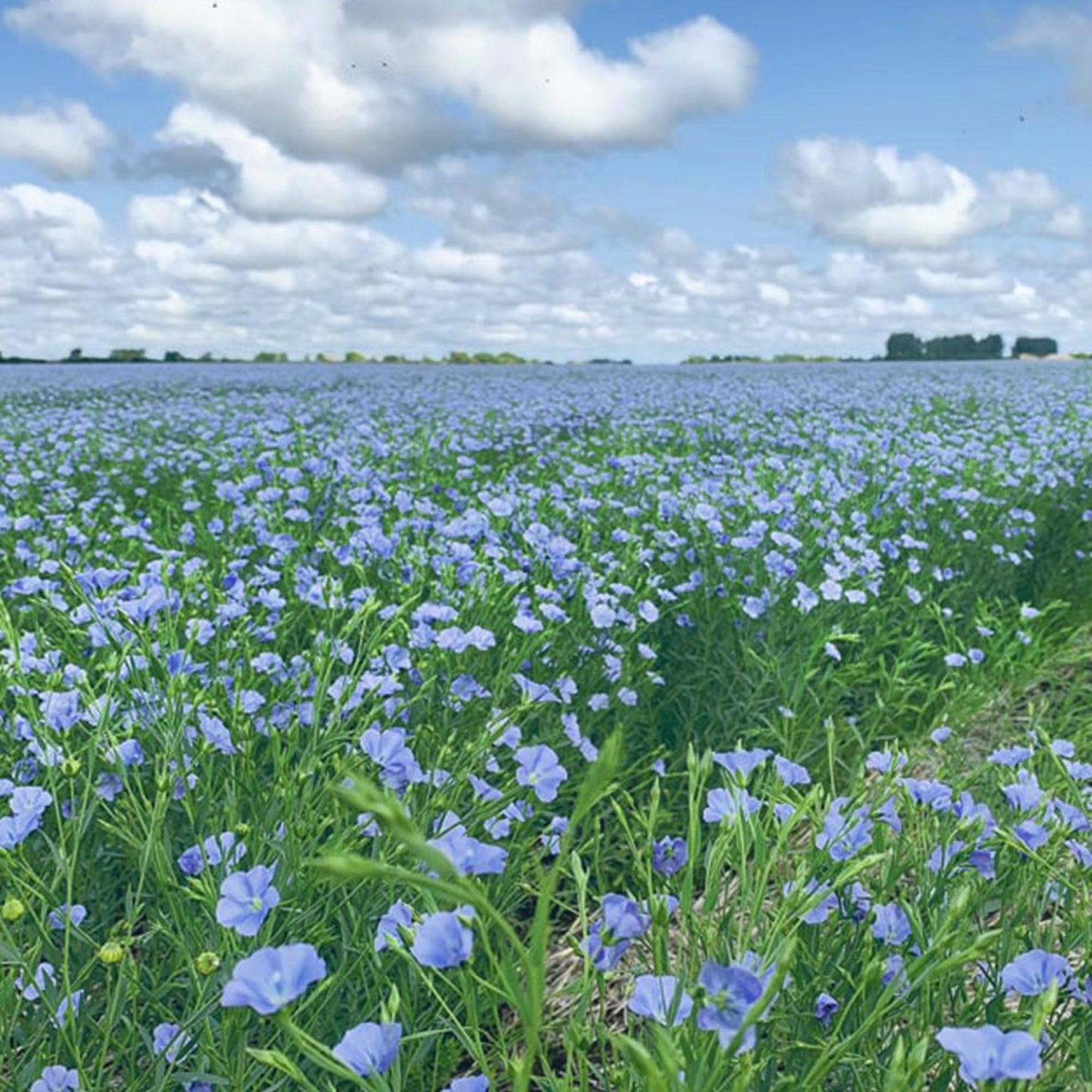 Flax seeds are usually planted in Spring and reaped in July. Over this period, the flax plant undergoes an enchanting metamorphosis and reaches its zenith with a fleeting flourish, as the entire field bursts into a celestial shade of blue for just a couple of weeks.