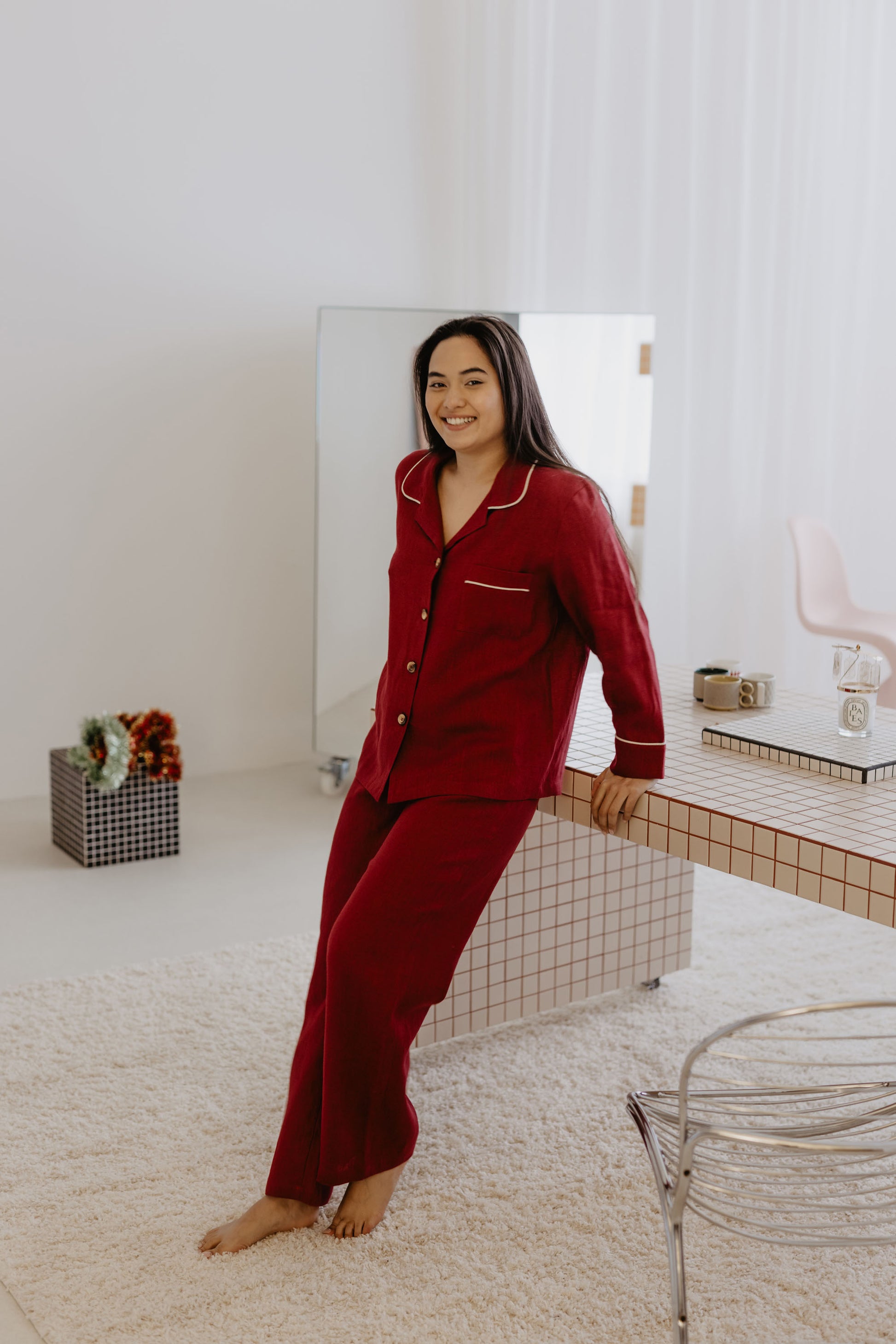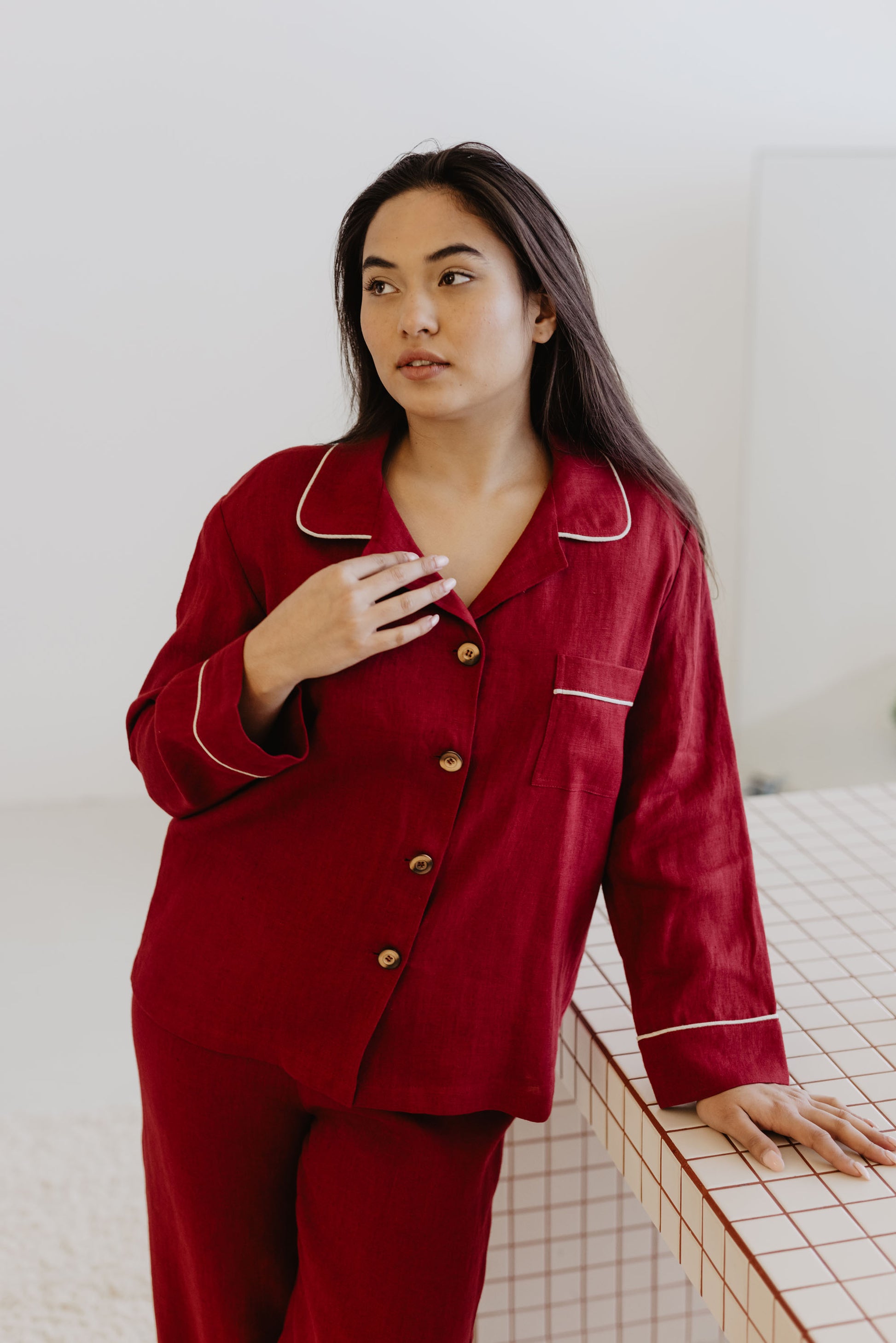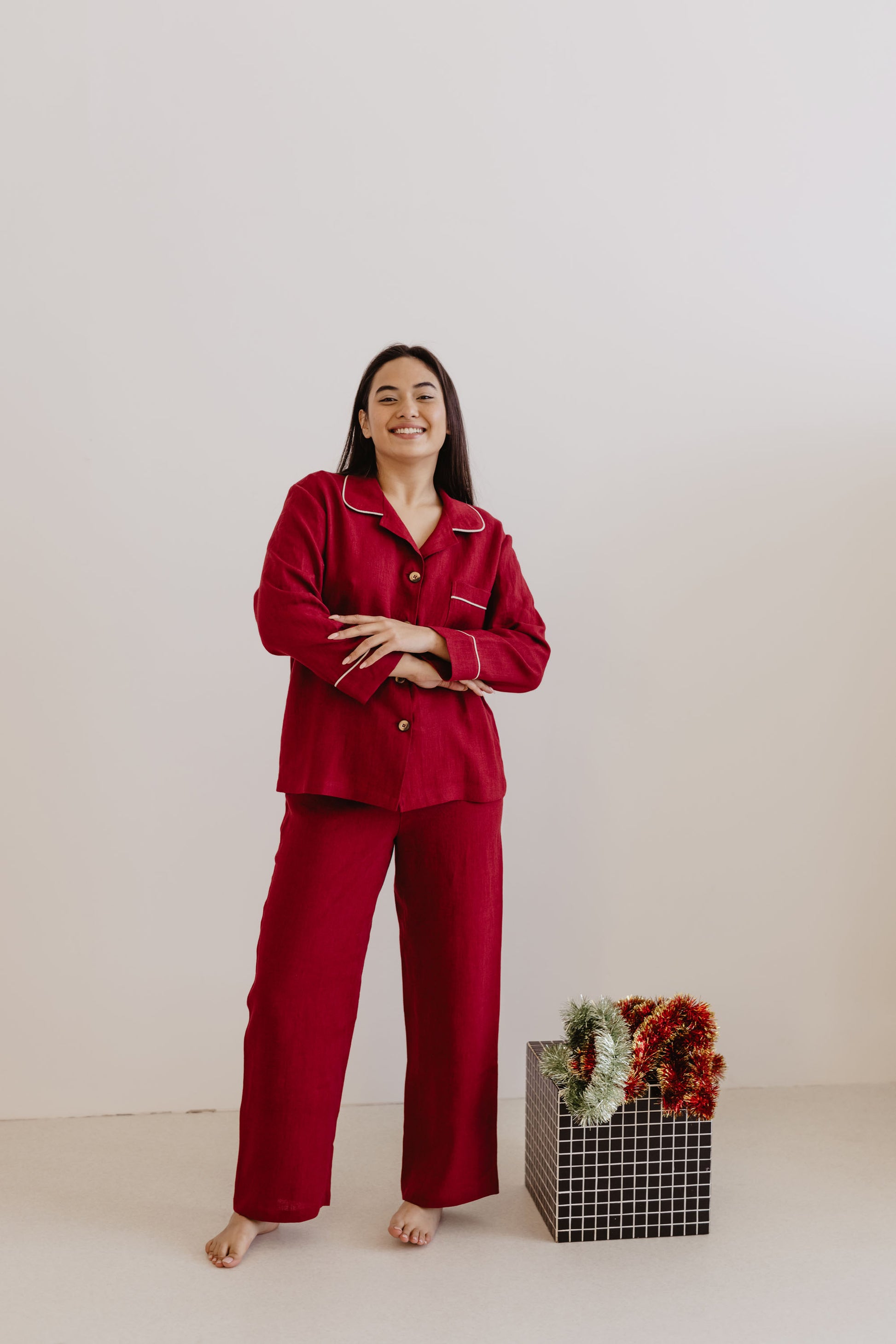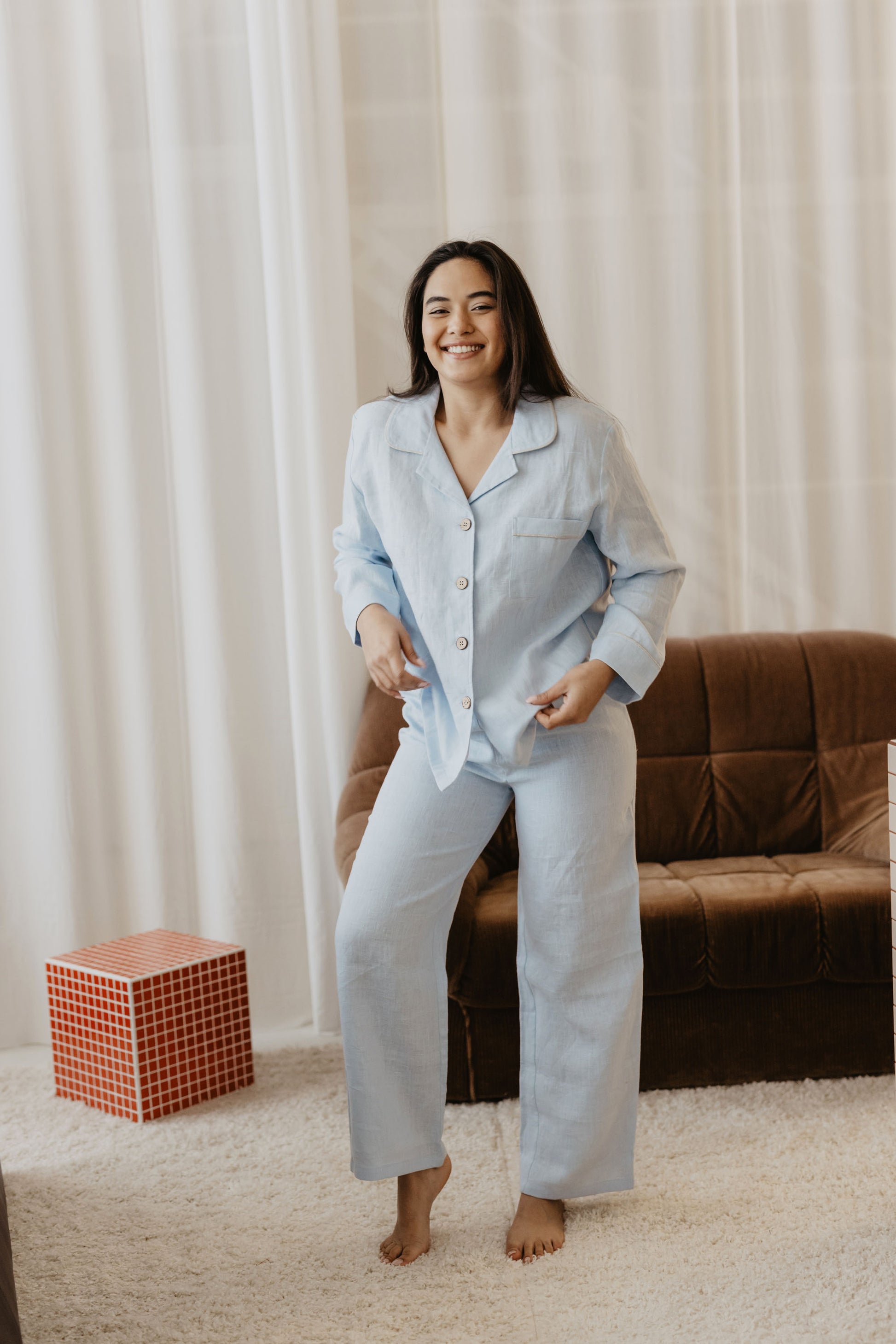 100% linen pajama set for women. Linen pants and shirt for a good night's sleep. The shirt is with wooden buttons and one pocket at the front. Pants are with an elastic band. Comfortable for sleep or chilling at home. Available in 3 colours and patterns. A perfect present for your partner, mother or sister!