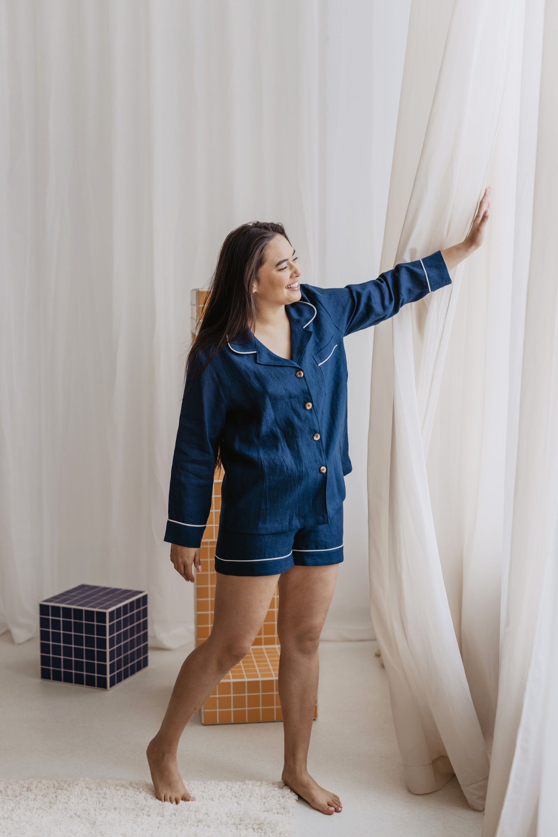 100% linen pajama set for women. Linen shorts and shirt for a good night's sleep. The shirt is with wooden buttons and one pocket at the front. Shorts are with an elastic band. Comfortable for sleep or chilling at home. Available in 3 colours and patterns. A perfect present for your partner, mother or sister!