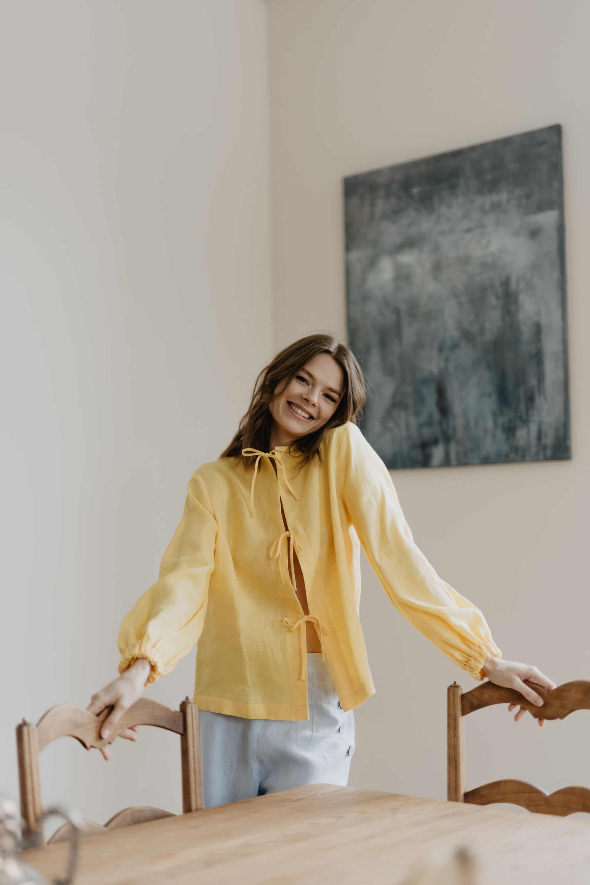 100% linen shirt for women inspired by the the Baltic coastal town Nida. A beautiful linen shirt with long ruffled balloon sleeves and charming ties at the front. Perfect for different looks and both casual and formal occasions: try wearing it with a pair of jeans for a smart look or linen bottoms for a romantic and more fancy look. The ties at the front add a unique and adjustable detail. Available in natural linen, dusty pink, sunshine yellow and sky blue.